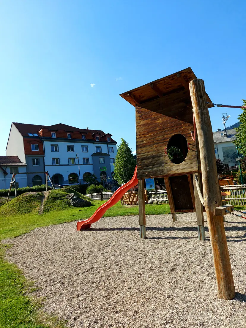 FITNA-Spielplatz in Puchberg am Schneeberg offers a play experience within a scenic, idyllic surrounding. It features a variety of equipment such as slides, different types of swingsets, a zip line, seesaws, and a popular water play element. The practical and tidy area includes seating for parents with pleasant views, and is considered suitable for a range of ages.