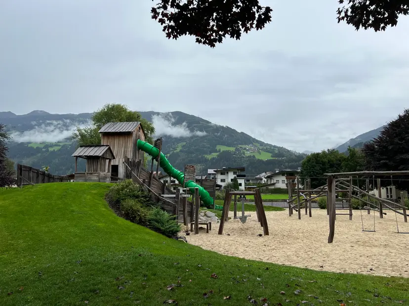 Glück auf Spielplatz in Zellberg, Tyrol offers visitors a diverse play experience. It features a wide array of creative equipment suitable for various ages, including a unique mining-themed area with tunnels, multiple slides, a water play zone, and extensive sand areas. Additional attractions include a mini-golf course and a kiosk, all set within a well-maintained environment with pleasant views.