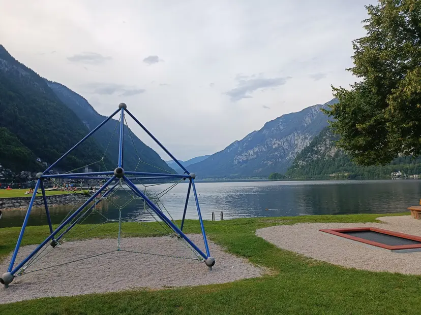 Spielplatz - Playground in Hallstatt offers visitors stunning lake and mountain views. It features diverse equipment such as a zipline, multiple slides, a diving board, and direct lake access with a water slide, making it popular for families and swimming. Visitors appreciate the free restroom and changing facilities, along with picnic areas, though some note the absence of nearby food or drink vendors.